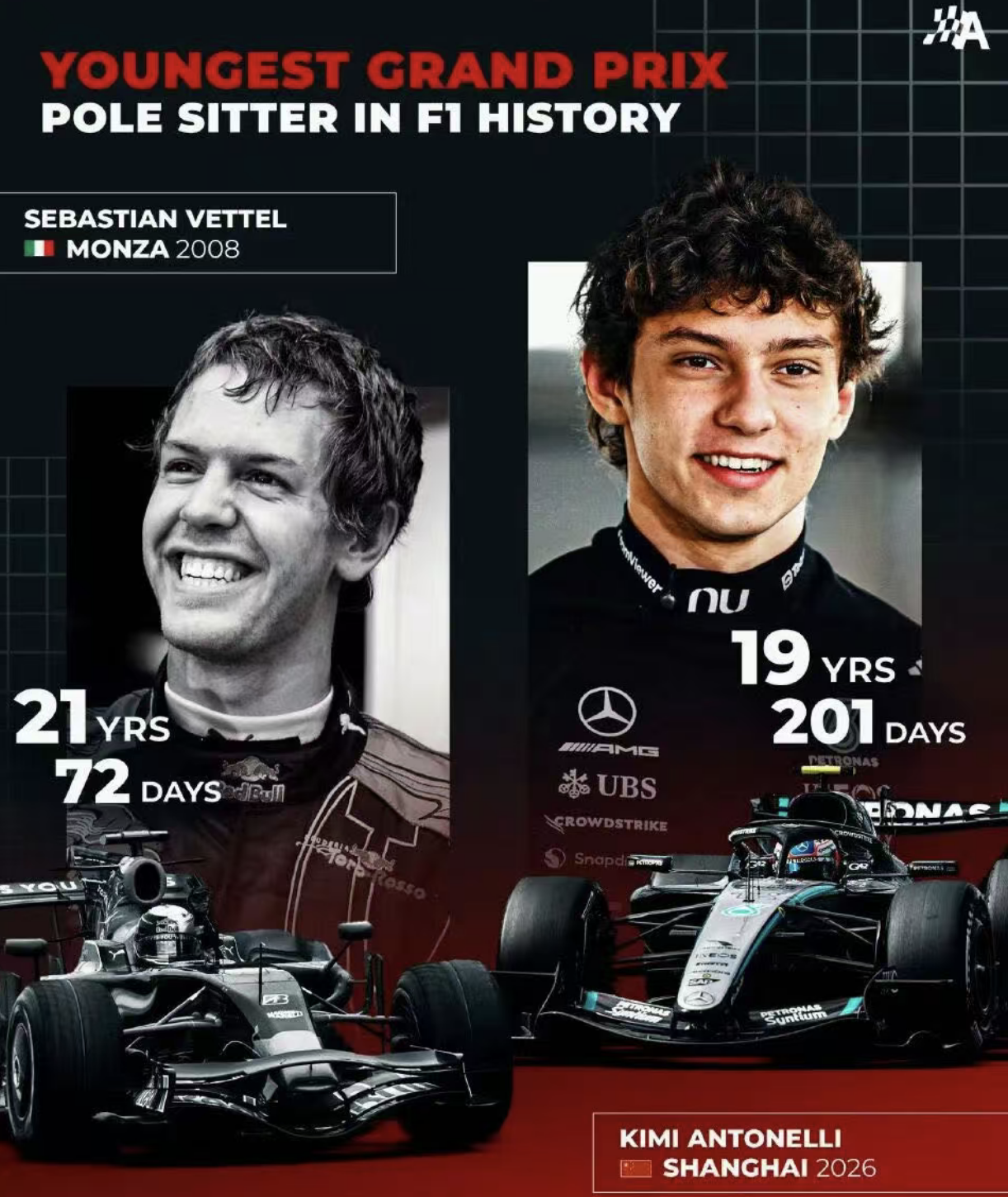刚刚结束的#2026F1中国大奖赛 排位赛中,梅奔车手安东内利获得F1职业生涯的首个杆位。就此,他以19岁201天的年龄超越瓦特尔(21岁72天)成为F1历史上最年轻的杆位获得者!恭喜“小kimi”安东内利!